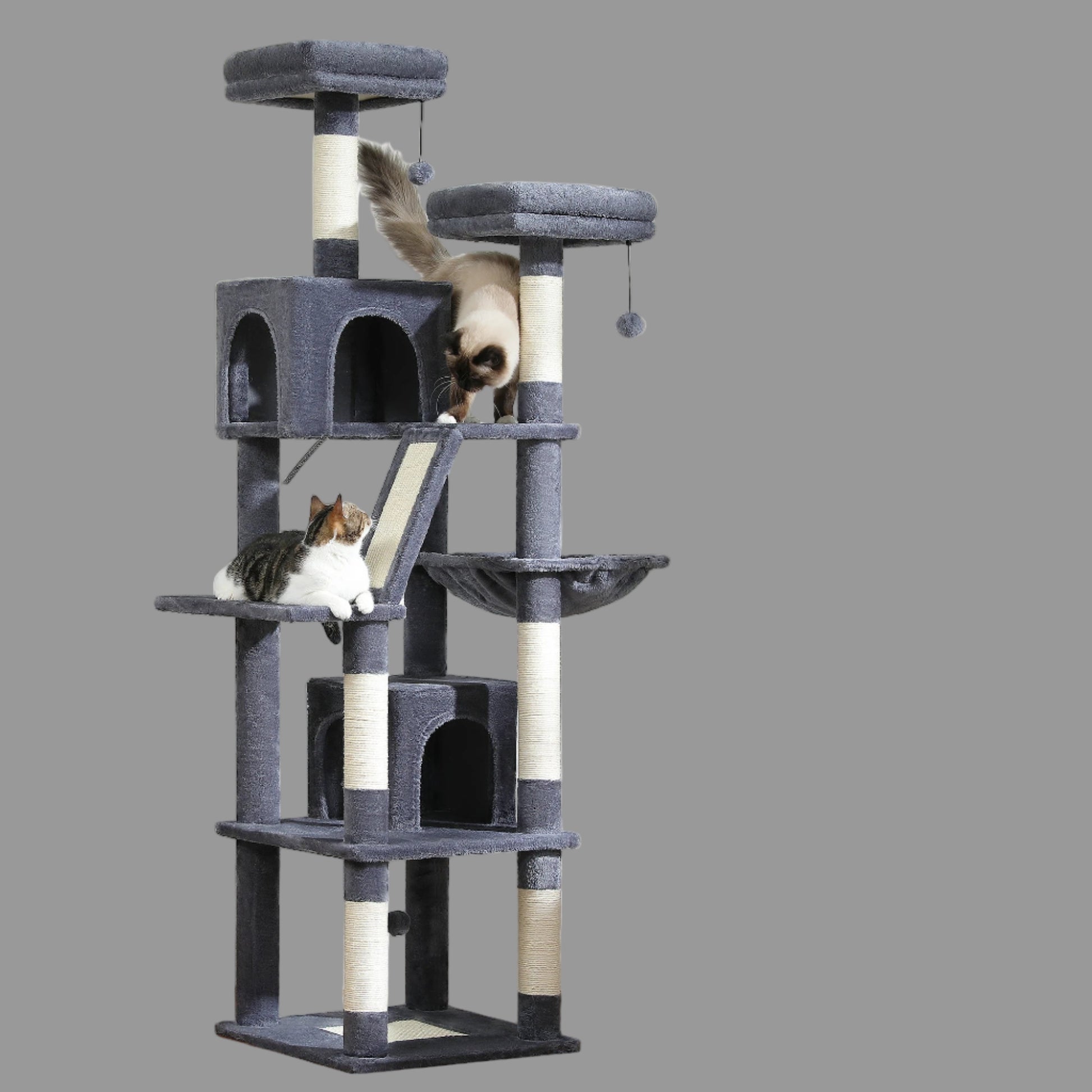 Cet arbre à chat 180cm offre de multiples zones d'activité avec 6 poteaux griffoirs en sisal, 2 grottes fermées, 2 perchoirs en peluche et un hamac. Structure complète pour grimper, griffer et se reposer.