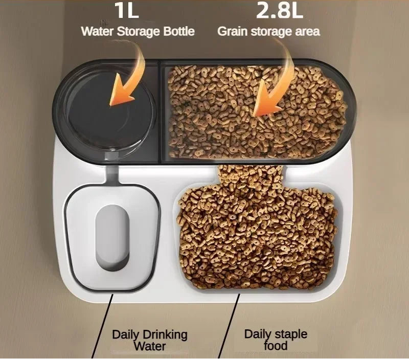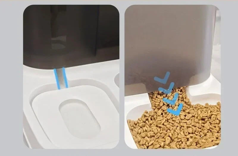 Le distributeur combine intelligemment l'espace nourriture sèche et eau dans une seule unité compacte. Les deux sections fonctionnent de manière autonome : les croquettes descendent par gravité d'un côté, tandis que l'eau reste fraîche de l'autre. Cette organisation optimise l'espace au sol tout en répondant aux besoins essentiels de votre animal.