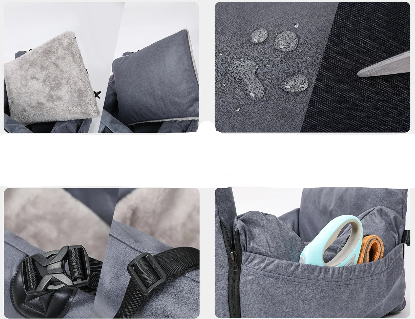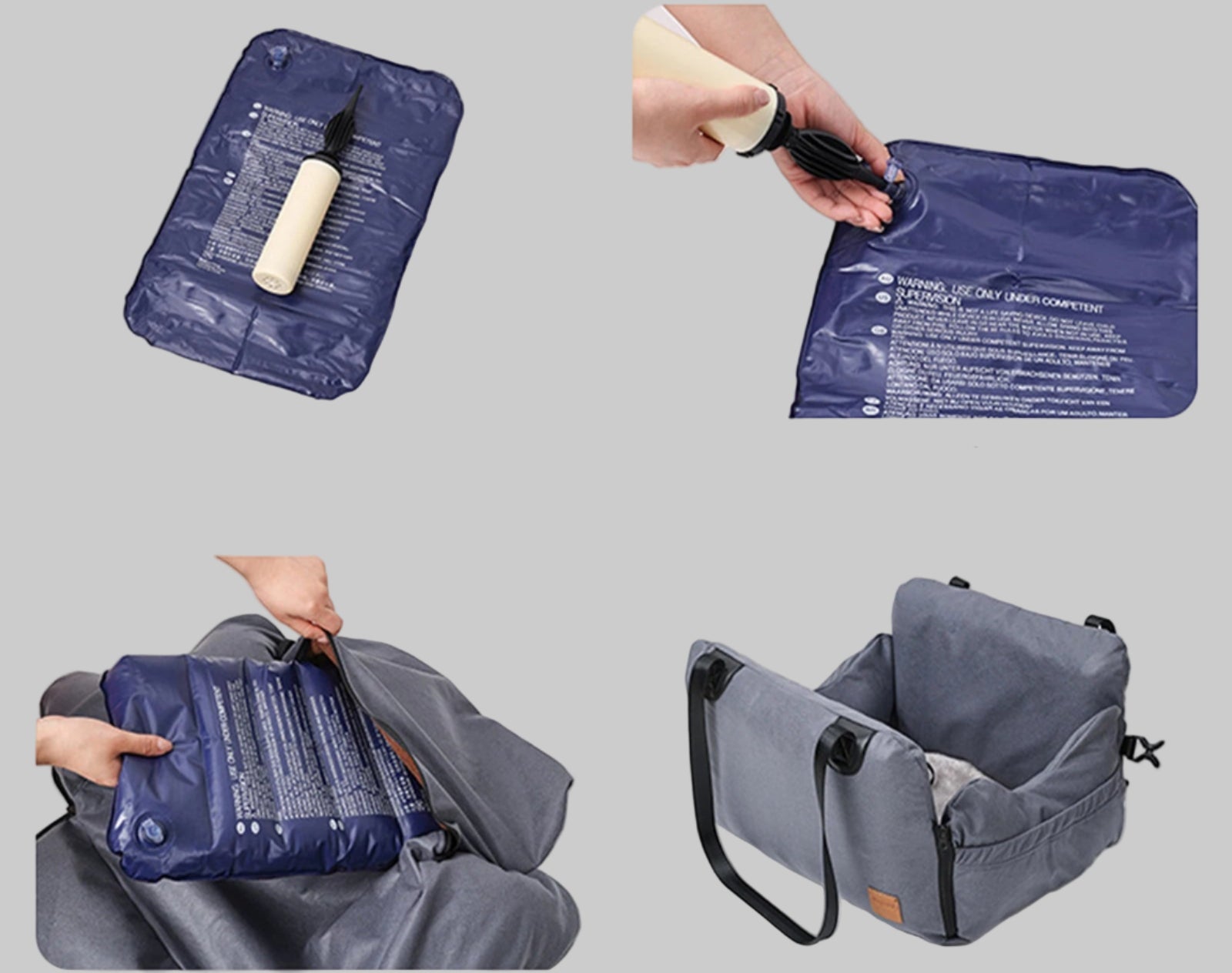 Ce siège auto pour chien intègre un airbag gonflable amovible avec dimensions 49×42×30cm. Équipé de ceinture sécurité et crochet métal, il offre un transport sécurisé pour chiens petits à moyens.