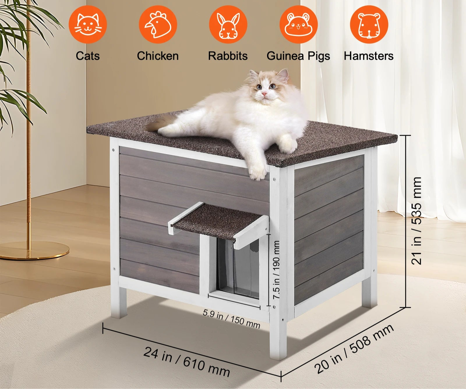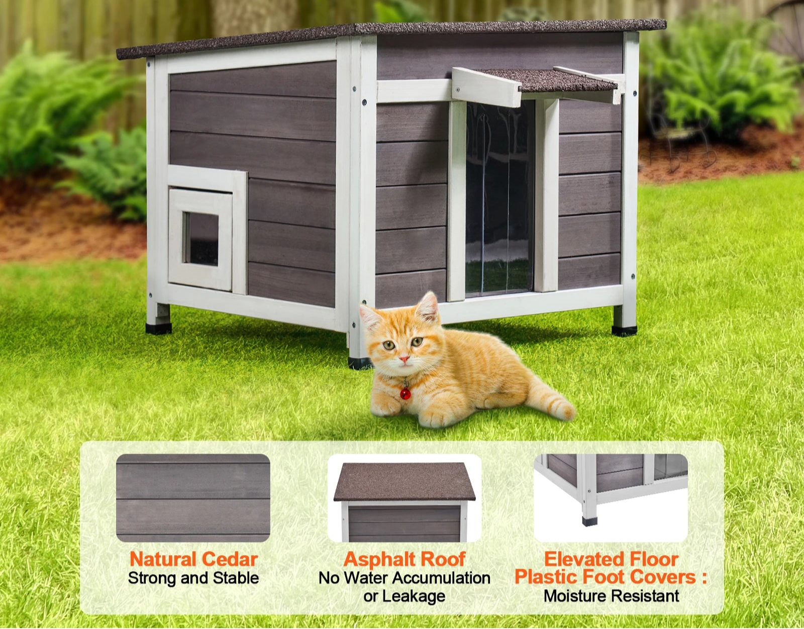Cette petite cabane en bois de cèdre de 61cm offre une isolation 6 faces pour protéger votre chat toute l'année. Avec son rideau PVC amovible et sa cloison intérieure, elle crée deux espaces distincts dans un format compact.